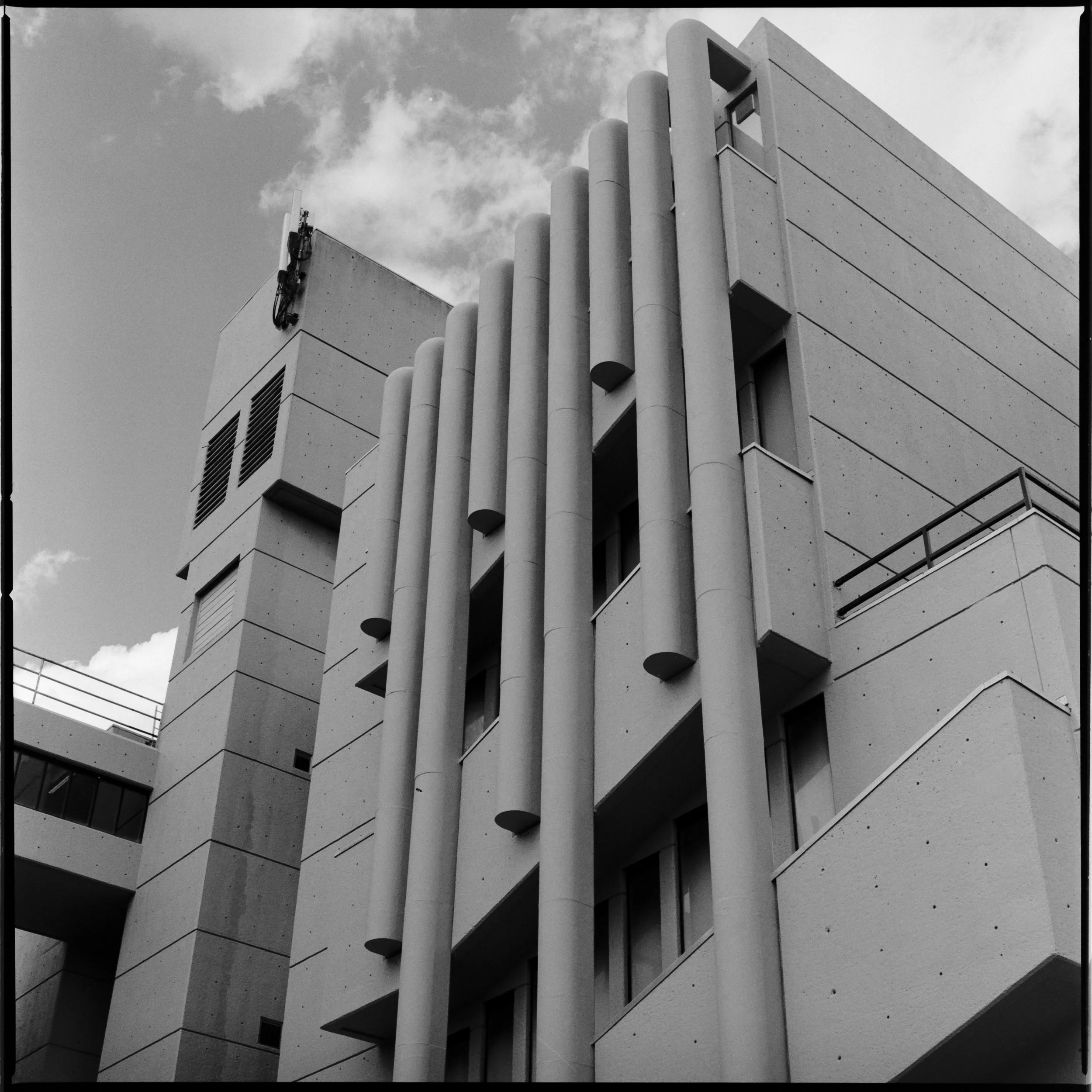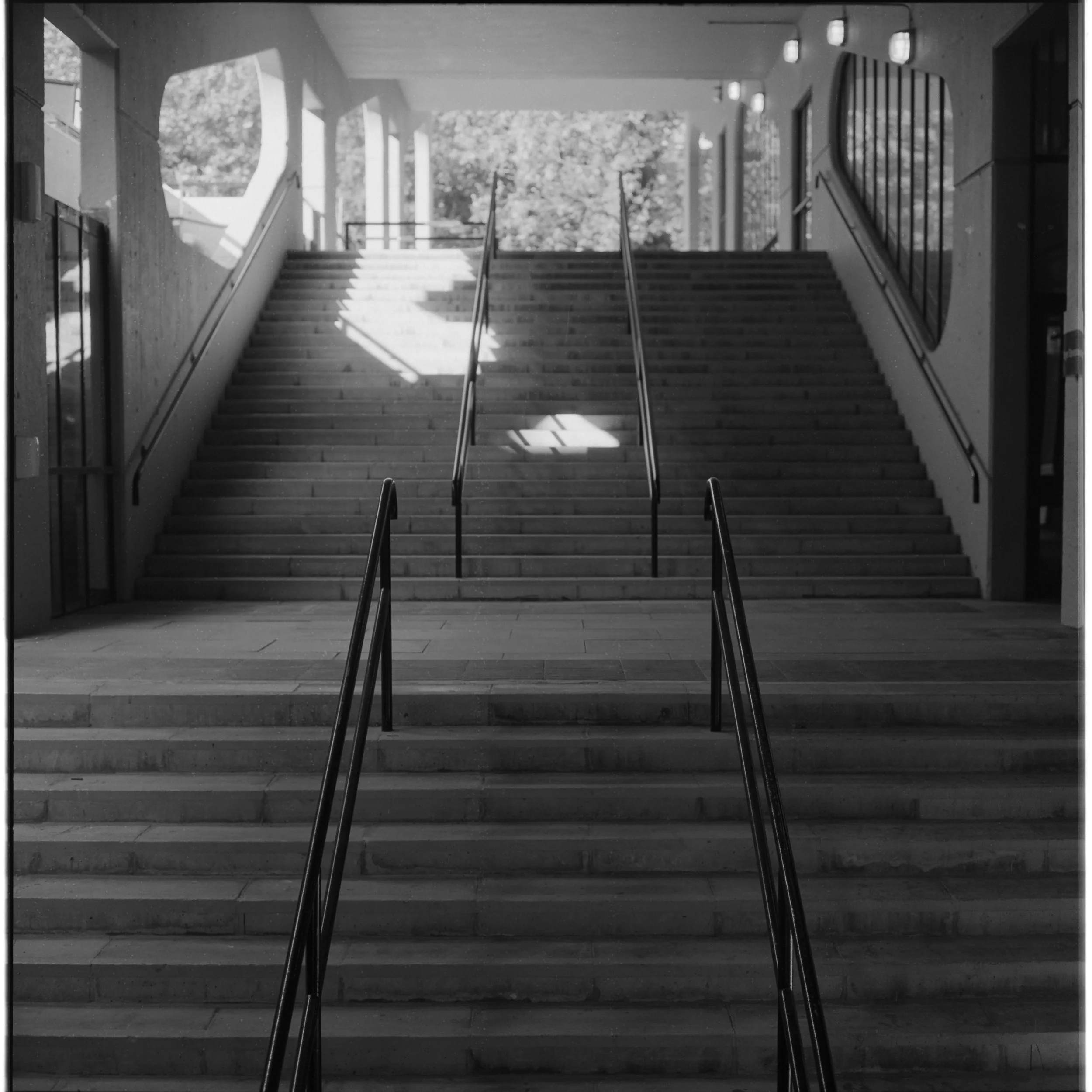 I am very happy with this frame. It’s only a DSLR scan of the negative, but it looks very promising to me. I like that even though the bottom right hand corner is very dark you can still make out the lines of the steps, and at the same time you can see the trees very clearly at the top, and even the building behind. I love the reflections in the windows on the right hand side, and the texture of the concrete all over. I can’t wait to get into the darkroom and make some prints of this. I have some very large paper (16” x 20”) and I am very keen to see what this looks like at that scale.
