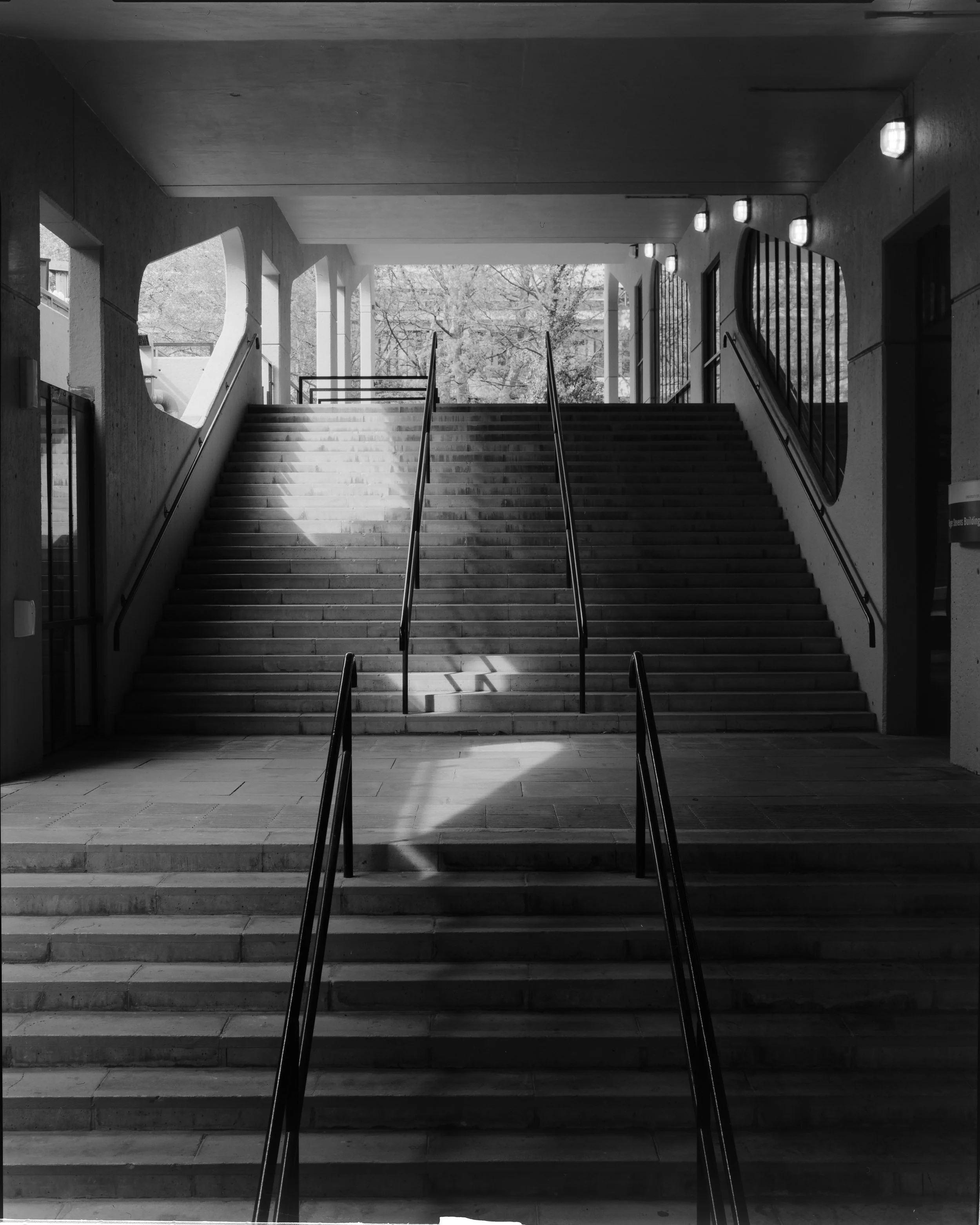 Yesterday I unexpectedly had a little time on my hands, so I went down to the university with my large format camera with the intention of capturing a good image of this staircase which was even sharper than the shot from the Rollei on the tripod. It was a nice day and campus was busier than I expected, but the back of this staircase is usually quiet. I took my time setting up, and decided to use my 135mm f/5.6 lens as it’s roughly equivalent to a 40mm lens on a 35mm camera, so not too wide.